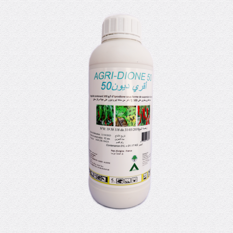 أقري ديون هو مبيد فطري له تأثير وقائي وعلاجي ينتمي إلى عائلة الديكاربوكسيديم ومجموعة الهيدانتوين. وهو يعمل بشكل وقائي عن طريق الاتصال عن طريق تثبيط إنبات الجراثيم أو عن طريق منع تطور الفطريات