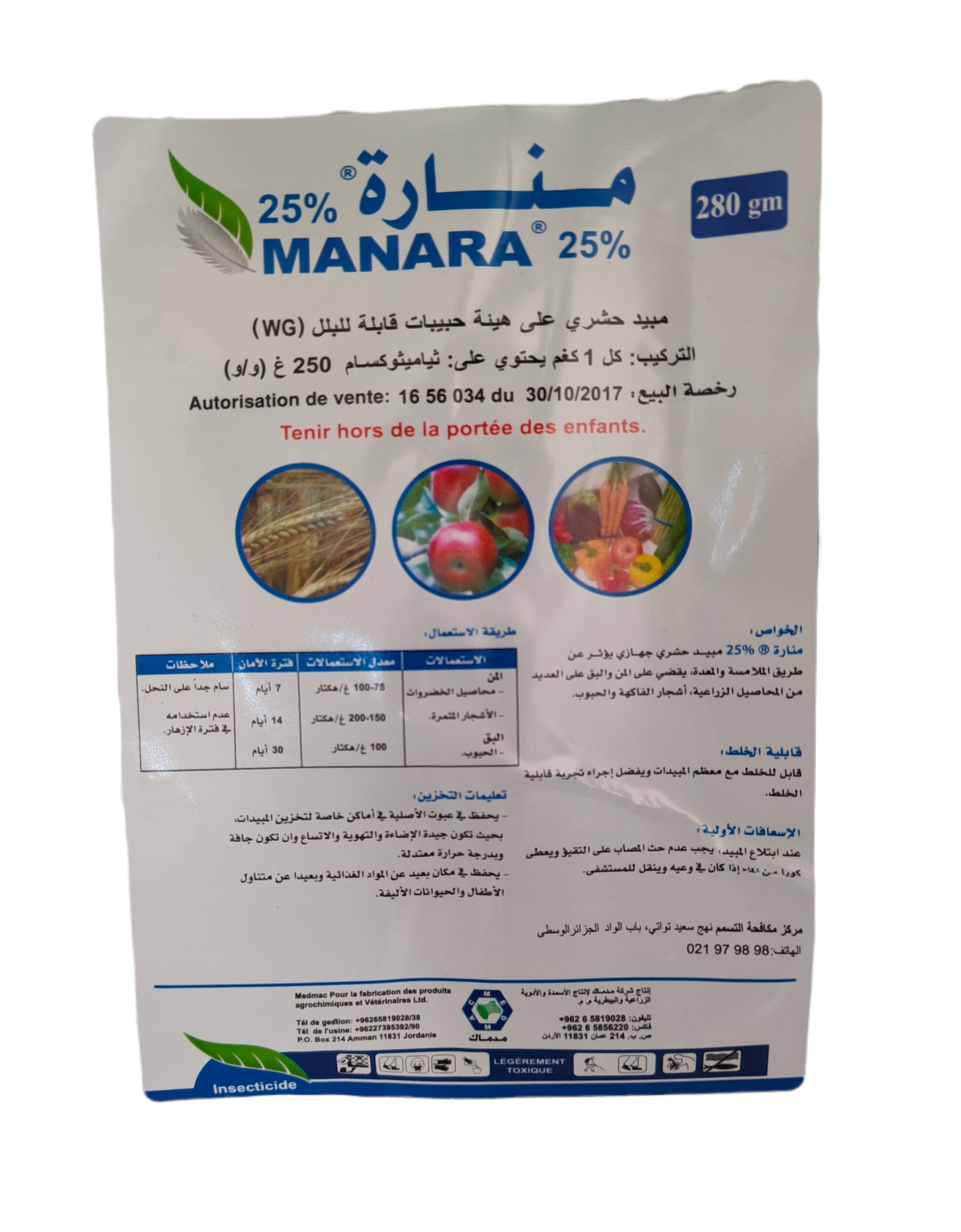 ثياميثوكسام 25٪ WG. مبيد حشري جهازي يؤثر بالملامسة وعمل المعدة ، يسيطر على العديد من الحشرات الزراعية مثل المن ، تريبس ، الذباب الأبيض ، نطاطات الأوراق ، الديدان السلكية ، خنفساء البطاطس ونطاطات الأوراق على الطماطم ، الفلفل ، الخيار ، القرع ، البطاطس ، الخس ، التفاح ، الخوخ والكرز .